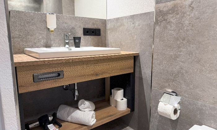 Die neuen Zimmer verfügen alle über einen großen Flat-TV und einen Balkon. Das Bad verfügt über eine ebenerdige Dusche mit Regenwasserbrause. Das Waschbecken befindet sich separat vom Bad getrennt, so ist es sowohl morgens als auch abends im Bad entspannter.