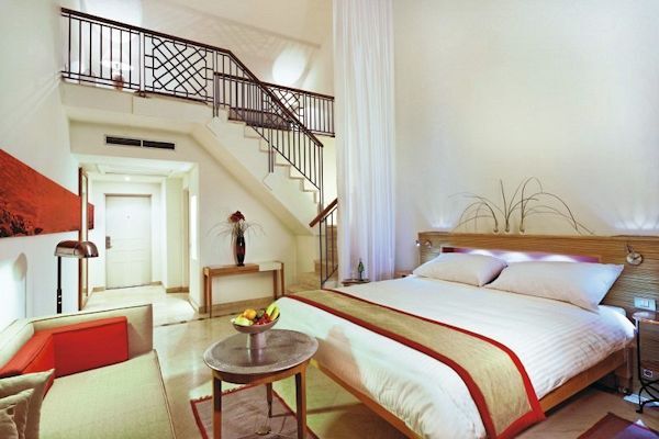 Familienzimmer: Gleiche Ausstattung wie Doppelzimmer, jedoch geräumiger und verfügen zusätzlich über einen offenen Schlafbereich (Maisonette) sowie einen großen Balkon mit Blick auf die Lagune oder den Pool.