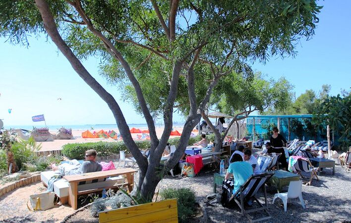 Das Surf und Kite Center befindet sich in der Mitte der Bucht, ca. 20 Gehminuten von der Medina (Altstadt) entfernt. Der Standort bringt viele Vorteile mit sich: Der Wind ist in diesem Bereich der Bucht wesentlich konstanter, da dort keine Windabdeckung herrscht. Das neue Center bietet viel mehr Platz, sodass wir auch Lagerungsmöglichkeiten für Wind- und Kitesurfer anbieten können. Die Schulung für Kitesurfer, Windsurfer und Wellenreiter findet direkt vor der Station statt. Das Restaurant Ocean Vagabond versorgt alle Surfer mit kleinen Gerichten und Getränken. Auf der Terrasse stehen Liegen zum Entspannen bereit, von denen man einen einmaligen Blick auf die Bucht hat.